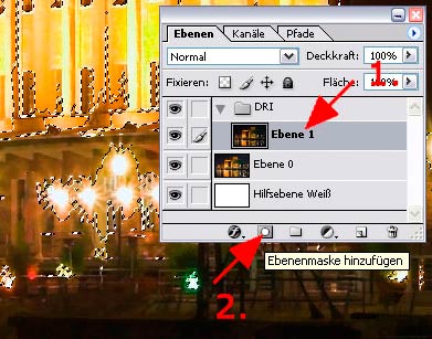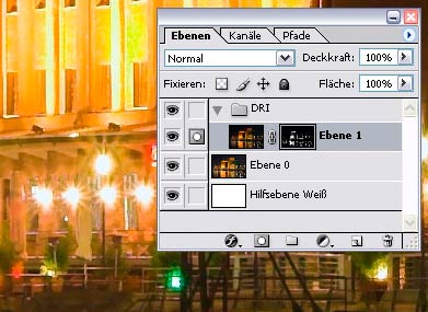 Es ergibt sich folgendes Bild im Ebenenfenster Neben der Miniatur des Bildes erscheint ein SW-Bild die Ebenenmaske Alle schwarzen Bereiche sind maskiert (nicht sichtbar) Gut sichtbar sind die harten Übergänge im Schein der Lampen ![]() auf der nächsten Seite geht's mit dem Gaußschen Weichzeichner weiter |